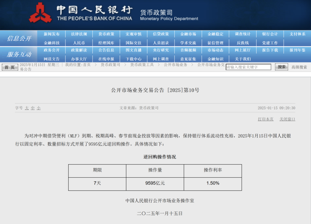 领先来看央行径作:为对冲中期假贷便利(MLF)到期、税期岑岭、春节前现款投放等成分的影响,保抓银行体系流动性充裕,1月15日,央行公开商场开展9595亿元7天期逆回购操作,操作利率为1.50%。