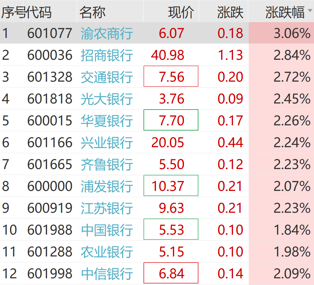 1月15日上昼,银行板块盘中走高。渝农商行涨超3%,招商银行、交通银行、光大银行、中原银行等跟涨。