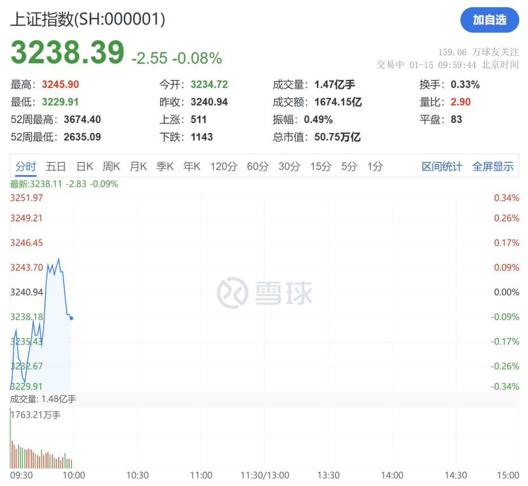 商场方面,1月15日,A股商场早间小幅低开,上证指数开盘报3234.72点,跌幅为0.19%。上昼大盘尽力拉升,上证指数盘中翻红后回落。适度发稿,创业板指跌超1.5%,北证50涨超1%。