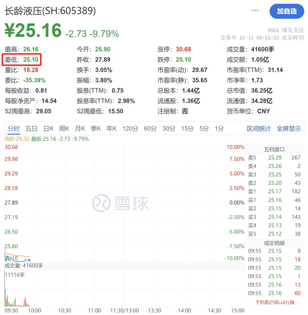 1月15日,长龄液压股价开盘走低,盘中最低达到25.10元/股,涉及跌停线。适度发稿,长龄液压股价仍踟蹰在跌停线角落。