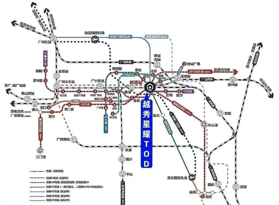 越秀星耀TOD:位于广州地铁13号线新塘站旁,直线距离仅约600米。通过新塘地铁站乘13号线(已通达)和13号线二期(在建中),翌日可畅通珠江新城,通联越秀、荔湾、白云等中心区,交通十分陋劣。